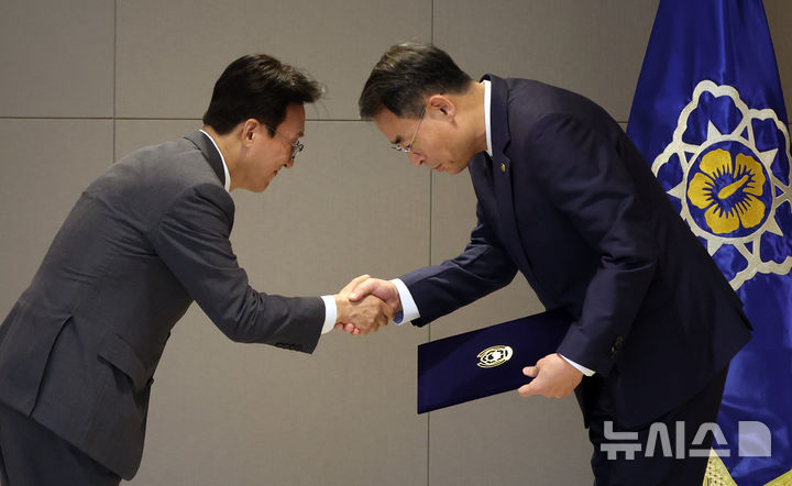 [세종=뉴시스] 강종민 기자 = 김민석 국무총리가 30일 세종시 정부세종청사에서 강희업 국토교통부 2차관에게 임명장을 전달하고 있다. 2025.07.30. [email protected]