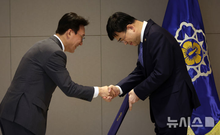 [세종=뉴시스] 강종민 기자 = 김민석 국무총리가 30일 세종시 정부세종청사에서 이상경 국토교통부 1차관에게 임명장을 전달하고 있다. 2025.07.30. [email protected]