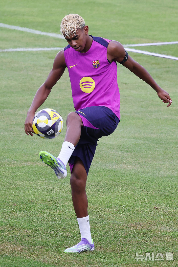 [고양=뉴시스] 조성우 기자 = FC바르셀로나 라민 야말이 30일 오후 경기 고양시 고양종합운동장에서 훈련하고 있다.