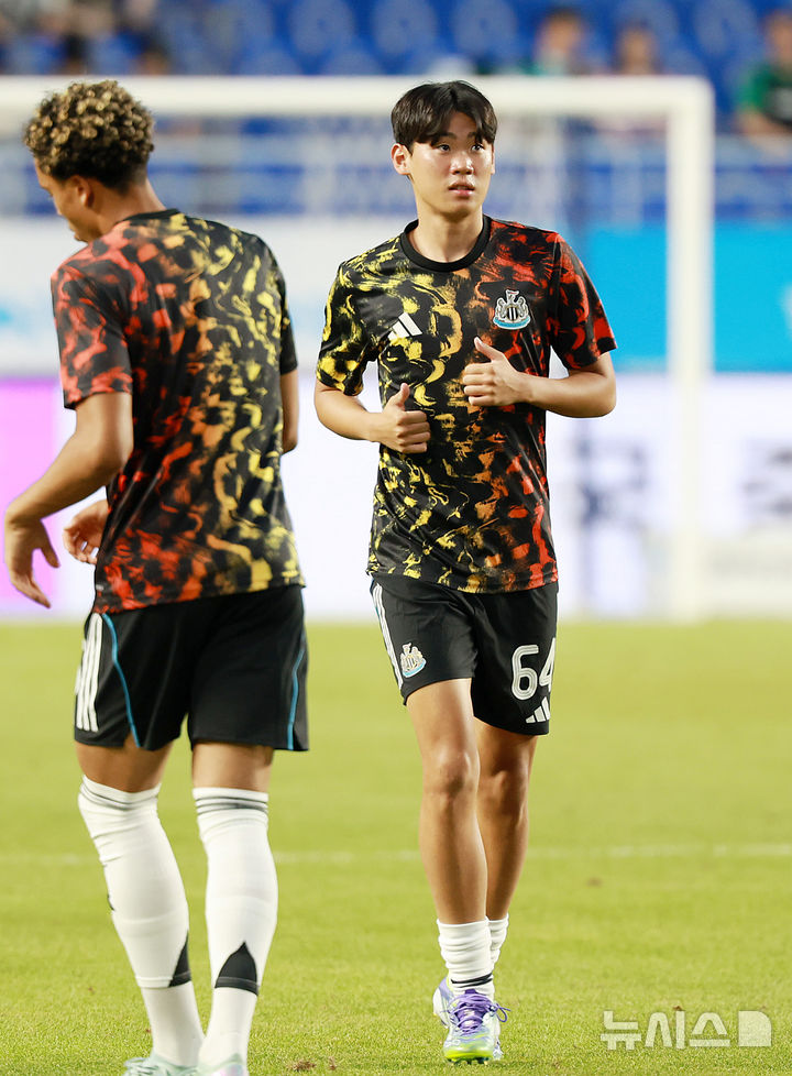 [수원=뉴시스] 이영환 기자 = 30일 오후 경기 수원시 팔달구 수원월드컵경기장에서 진행되는 2025 쿠팡플레이 시리즈 뉴캐슬 유나이티드와 팀 K리그의 경기를 앞두고 뉴캐슬 박승수가 몸을 풀고 있다. 2025.07.30. [email protected]
