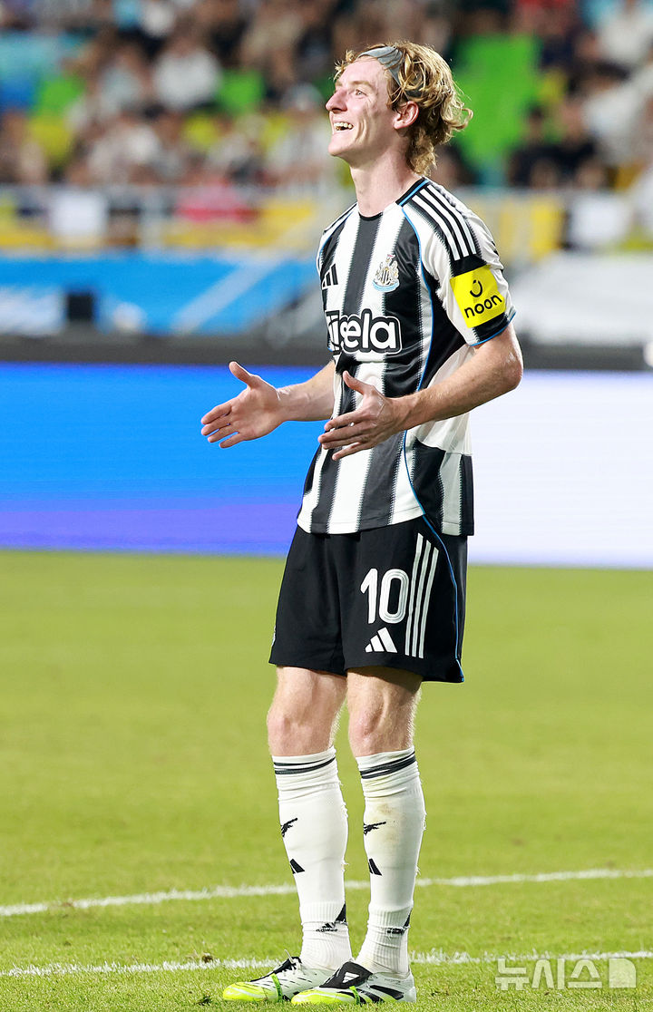 [수원=뉴시스] 이영환 기자 = 30일 오후 경기 수원시 팔달구 수원월드컵경기장에서 열린 2025 쿠팡플레이 시리즈 뉴캐슬 유나이티드와 팀 K리그의 경기, 뉴캐슬 앤서니 고든이 슛을 시도한 후 아쉬워 하고 있다. 2025.07.30. [email protected]