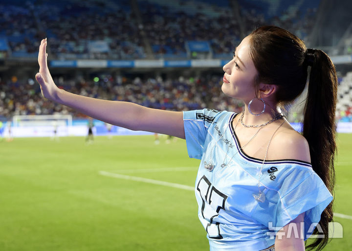 [수원=뉴시스] 이영환 기자 = 30일 오후 경기 수원시 팔달구 수원월드컵경기장에서 열린 2025 쿠팡플레이 시리즈 뉴캐슬 유나이티드와 팀 K리그의 경기에서 하프타임 공연을 마친 아이브 안유진이 그라운드를 나서고 있다. 2025.07.30. [email protected]