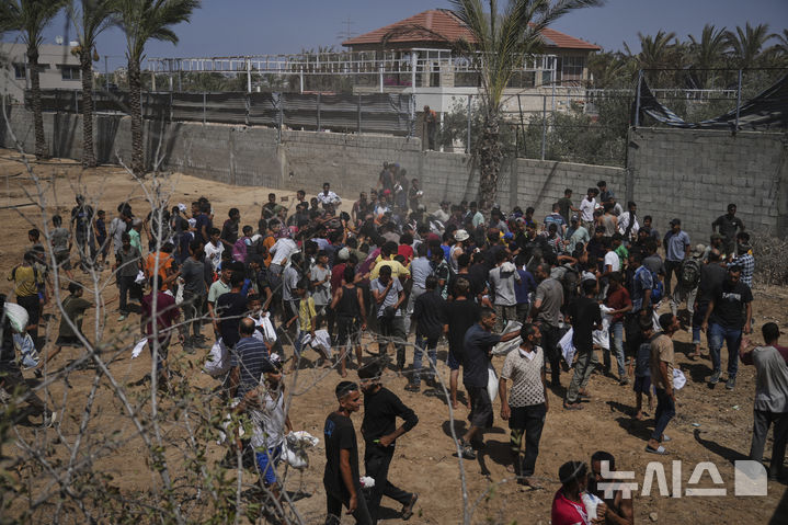[자와이다=AP/뉴시스] 30일(현지 시간) 가자지구 중부 자와이다에서 팔레스타인 주민들이 아랍에미리트(UAE)가 공중 투하한 인도주의 지원 물품을 수거하기 위해 몰려들고 있다. 2025.07.31.