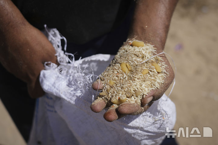 [자와이다=AP/뉴시스] 30일(현지 시간) 가자지구 중부 자와이다에서 한 팔레스타인 주민이 아랍에미리트(UAE)가 공중 투하한 인도주의 지원 물품을 수거해 내용물을 확인하고 있다. 2025.07.31.