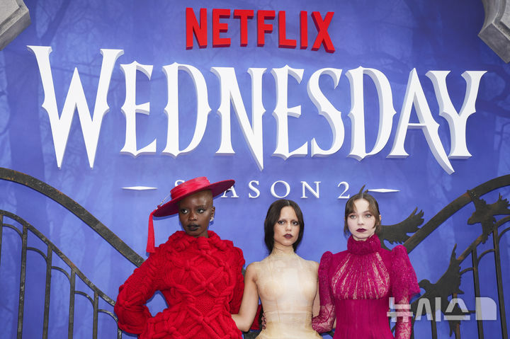 [런던=AP/뉴시스] 배우 조이 선데이(왼쪽부터), 제나 오르테가, 에마 마이어스가 30일(현지 시간) 영국 런던에서 열린 넷플릭스 시리즈 '웬즈데이 시즌2' 시사회에 참석해 포토타임을 갖고 있다. 2025.07.31.