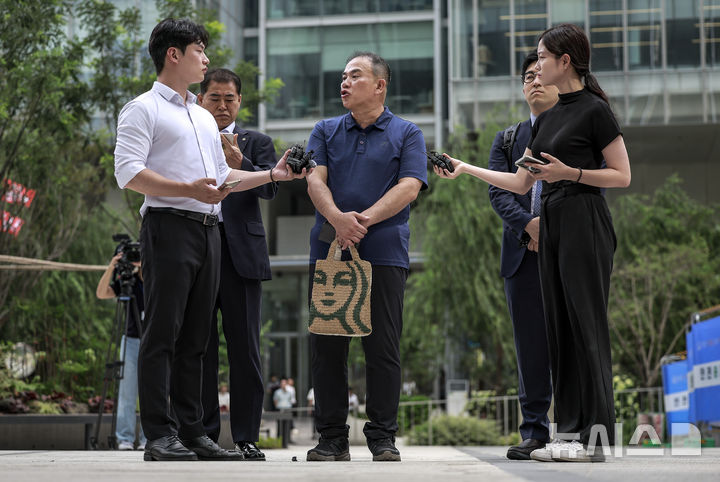 [서울=뉴시스] 정병혁 기자 = 공천개입 의혹 및 여론조사 조작 의혹을 받고 있는 명태균 씨가 31일 서울 종로구 김건희 특검팀(특별검사 민중기) 사무실로 조사를 받기 위해 출석하며 취재진 질문에 답하고 있다. 2025.07.31. [email protected]