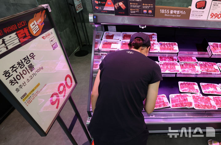 [서울=뉴시스] 이영환 기자 = 31일 오전 서울 강서구 홈플러스 메가푸드마켓 라이브 강서점에서 열린 앵콜 홈플런 NOW 할인전에서 호주청정우 척아이롤이 100g 당 990원에 판매되고 있다. 2025.07.31. [email protected]
