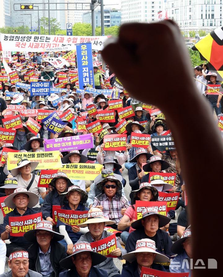 [세종=뉴시스] 강종민 기자 = 전국에서 온 사과 재배 농민들이 31일 세종시 정부세종청사 산업통상자원부 앞에서 미국산 사과 수입 반대를 외치고 있다. 2025.07.31. [email protected]