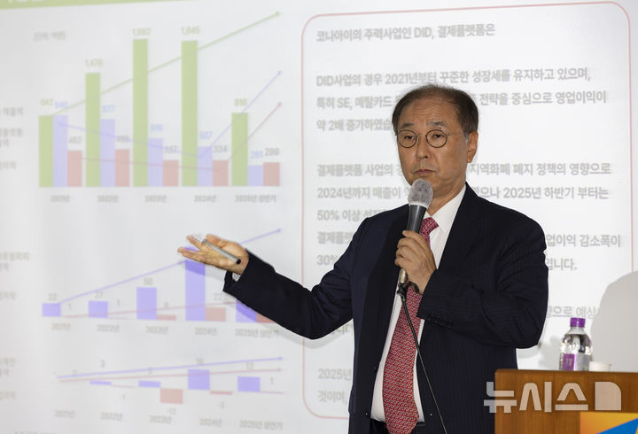[서울=뉴시스] 김근수 기자 = 조정일 코나아이 대표이사가 31일 서울 여의도 한국금융투자협회 금융투자교육원에서 열린 2025 2분기 기업설명회(IR) 및 스테이블코인 시연회에서 사업실적을 발표하고 있다. 2025.07.31. [email protected]