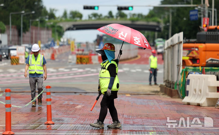 [서울=뉴시스] 김선웅 기자 = 서울을 비롯한 전국에 폭염이 계속된 31일 서울 강남구 개포동 양재대로 개선사업 공사현장에서 한 장비유도원(신호수)이 양산을 몸에 장착하고 업무를 수행하고 있다. 2025.07.31. [email protected]