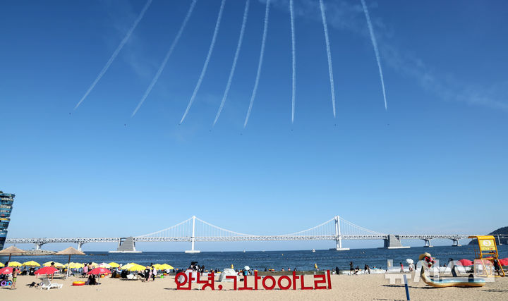 피서 절정 부산 광안리해수욕장 블랙이글스 연습비행