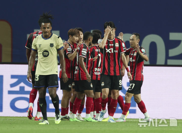 [서울=뉴시스] 김근수 기자 = 31일 서울 마포구 상암월드컵경기장에서 열린 FC 바르셀로나 2025 아시아 투어 FC 바르셀로나 대 FC서울의 경기, FC서울 조영욱이 골을 넣고 선수들과 기뻐하고 있다. 2025.07.31. [email protected]
