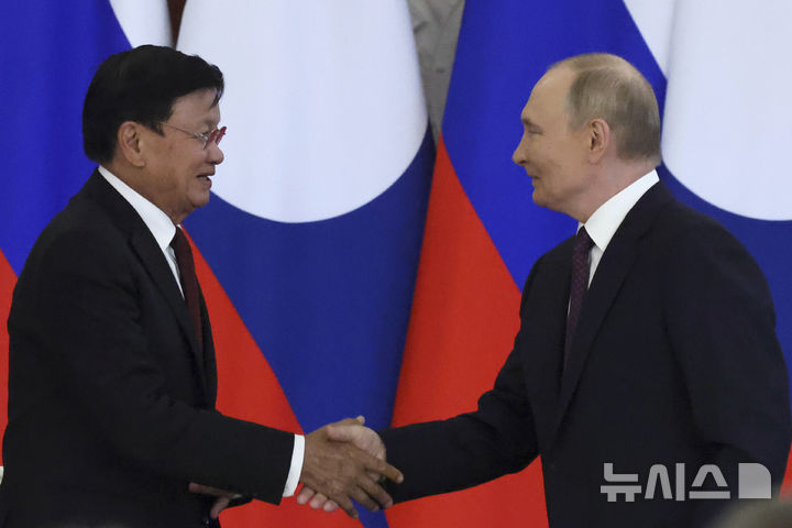 [모스크바=AP/뉴시스] 블라디미르 푸틴(오른쪽) 러시아 대통령과 통룬 시술리트 라오스 대통령이 지난달 31일(현지 시간) 러시아 모스크바 크렘린 궁에서 문서 교환을 마치고 악수하고 있다. 푸틴 대통령은 양국 간 화물 운송이 증가하고 있어서 중국을 경유하는 철도 건설을 추진한다고 밝혔다. 2025.08.01.