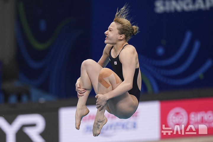 [싱가포르=AP/뉴시스] 정다연이 1일(현지 시간) 싱가포르 스포츠 허브 아쿠아틱 센터에서 열린 2025 세계수영연맹(WA) 세계선수권대회 다이빙 여자 3m 스프링보드 예선 경기를 펼치고 있다. 2025.08.01.