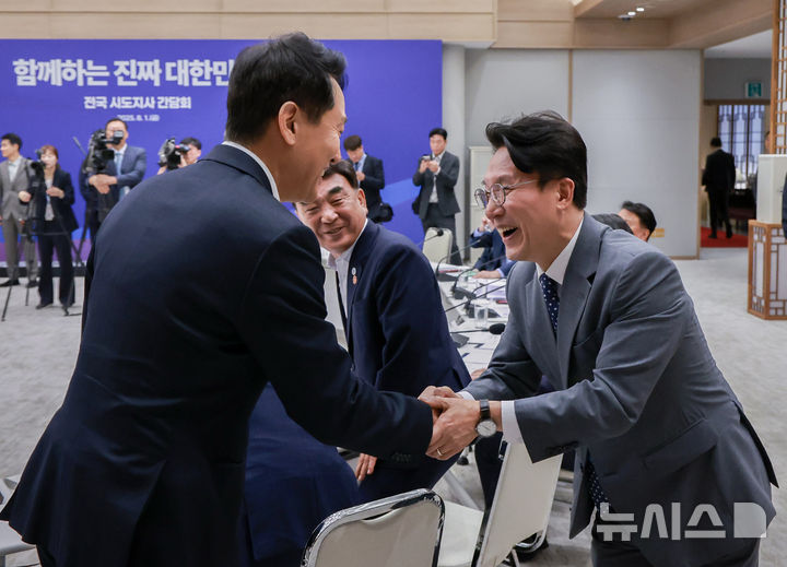 [서울=뉴시스] 고범준 기자 = 김민석 국무총리와 오세훈 서울시장이 1일 서울 용산 대통령실 청사에서 열린 전국 시도지사 간담회에 앞서 악수하고 있다. (대통령실통신사진기자단) 2025.08.01. [email protected]