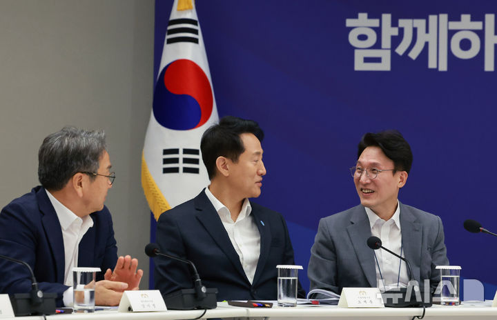 [서울=뉴시스] 고범준 기자 = 김민석 국무총리와 오세훈 서울시장이 1일 서울 용산 대통령실 청사에서 열린 전국 시도지사 간담회에 앞서 대화하고 있다. 왼쪽은 강기정 광주광역시장. (대통령실통신사진기자단) 2025.08.01. [email protected]