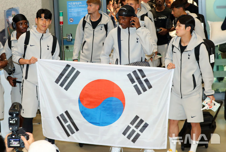 [인천공항=뉴시스] 김혜진 기자 = 토트넘 홋스퍼의 손흥민(왼쪽), 양민혁이 1일 오후 인천국제공항 제1터미널을 통해 입국해 팬들에게 인사를 하고 있다.