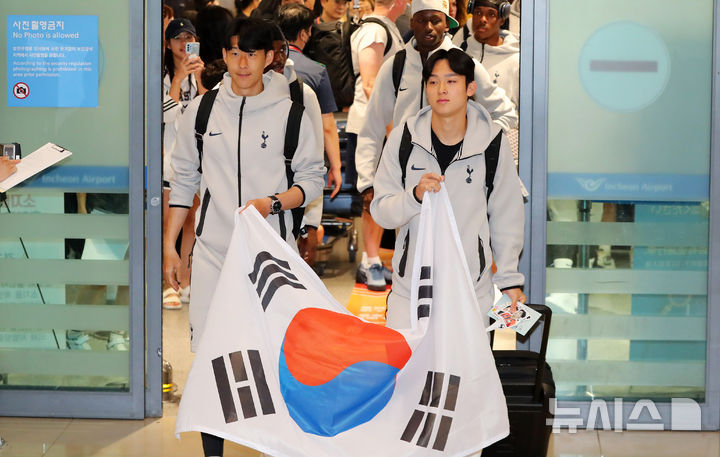 [인천공항=뉴시스] 김혜진 기자 = 토트넘 홋스퍼의 손흥민(왼쪽), 양민혁이 1일 오후 인천국제공항 제1터미널을 통해 입국해 팬들에게 인사를 하고 있다.