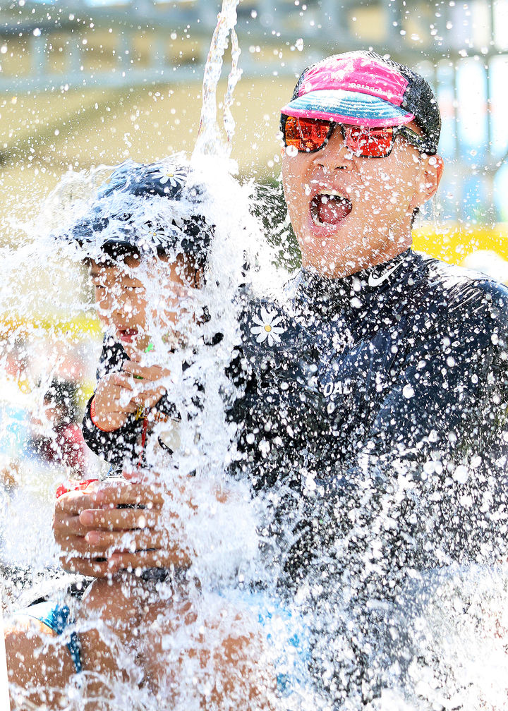 [서울=뉴시스] 정병혁 기자 = 본격적인 휴가철이 시작된 1일 오후 대화면 땀띠공원 일원에서 열린 강원 평창군 대표 여름 축제인 '2025 평창더위사냥축제'를 찾은 방문객들이 물양동이 냉천수 폭포를 맞으며 더위를 식히고 있다. (사진=평창군 제공) 2025.08.01. [email protected] *재판매 및 DB 금지