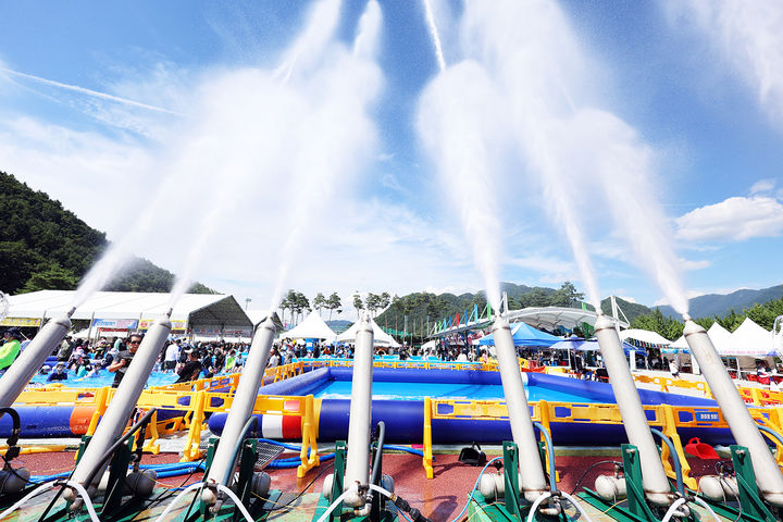 [서울=뉴시스] 정병혁 기자 = 본격적인 휴가철이 시작된 1일 오후 대화면 땀띠공원 일원에서 열린 강원 평창군 대표 여름 축제인 '2025 평창더위사냥축제'를 찾은 방문객들을 향해 시원한 물대포가 터지고 있다. (사진=평창군 제공) 2025.08.01. [email protected] *재판매 및 DB 금지