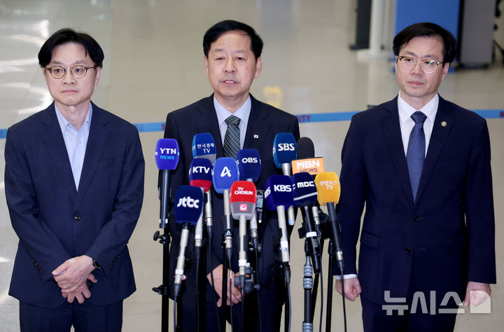 [인천공항=뉴시스] 김진아 기자 = 한미 관세 협상을 마친 구윤철 부총리 겸 기획재정부 장관이 1일 인천국제공항 2터미널을 통해 귀국, 취재진의 질문에 답하고 있다.