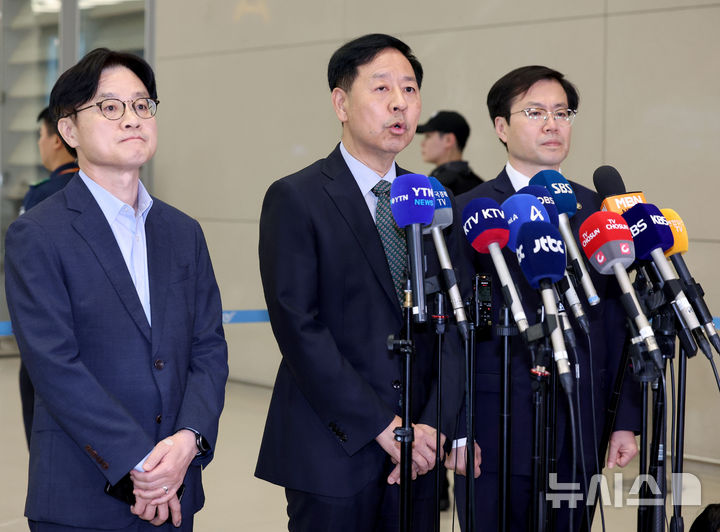 [인천공항=뉴시스] 김진아 기자 = 한미 관세 협상을 마친 구윤철 부총리 겸 기획재정부 장관이 1일 인천국제공항 2터미널을 통해 귀국, 취재진의 질문에 답하고 있다.