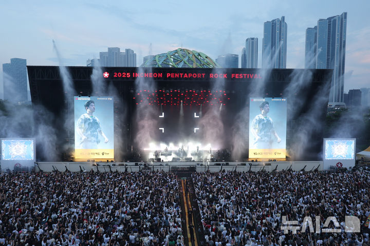 [인천=뉴시스] 전진환 기자 = 1일 오후 인천 연수구 송도달빛축제공원에서 열린 '2025 인천펜타포트 락 페스티벌'에서 관람객들이 장기하의 공연을 관람하고 있다. 2025.08.01. [email protected]