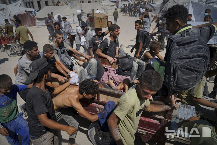 [베이트 라히야=AP/뉴시스] 1일(현지 시간) 가자지구 북부 베이트 라히야 외곽에서 팔레스타인 주민들이 가자시티로 향하던 인도적 물품 수송 트럭에 몰려들다 다친 부상자를 옮기고 있다. 2025.08.02.