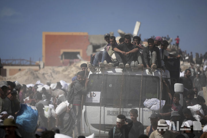 [베이트 라히야=AP/뉴시스] 1일(현지 시간) 가자지구 북부 베이트 라히야 외곽에서 팔레스타인 주민들이 가자시티로 향하던 인도적 물품 수송 트럭에서 내린 밀가루 자루를 나르고 있다. 2025.08.02.