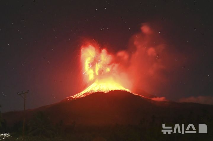 [플로레스섬=AP/뉴시스] 인도네시아 에너지광물자원부가 제공한 사진에 1일(현지 시간) 동누사텡가라주 플로레스섬에 있는 르워토비 라키라키 하산이 분화해 용암이 흘러내리고 있다. 이에 따라 화산재가 10㎞ 높이까지 치솟았고 반경 6㎞ 이내 접근이 금지됐다. 2025.08.02.