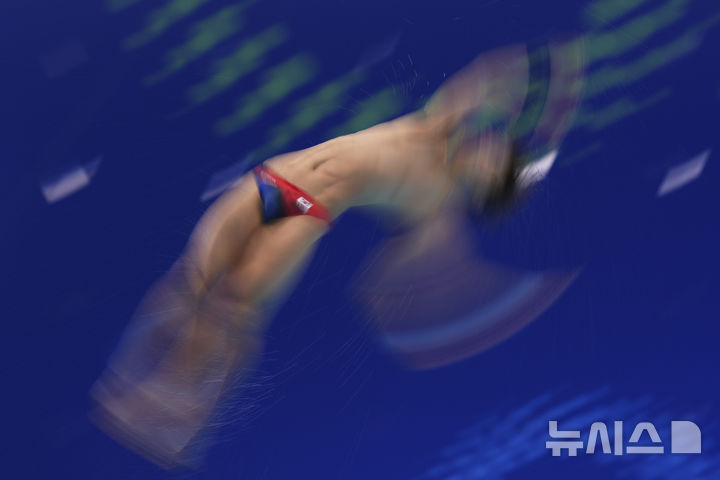 [싱가포르=AP/뉴시스] 강민혁이 2일(현지 시간) 싱가포르 스포츠 허브 아쿠아틱 센터에서 열린 2025 세계수영연맹(WA) 세계선수권대회 다이빙 남자 10m 플랫폼 예선 경기를 펼치고 있다. 2025.08.02.