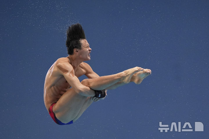 [싱가포르=AP/뉴시스] 강민혁이 2일(현지 시간) 싱가포르 스포츠 허브 아쿠아틱 센터에서 열린 2025 세계수영연맹(WA) 세계선수권대회 다이빙 남자 10m 플랫폼 예선 경기를 펼치고 있다. 2025.08.02.