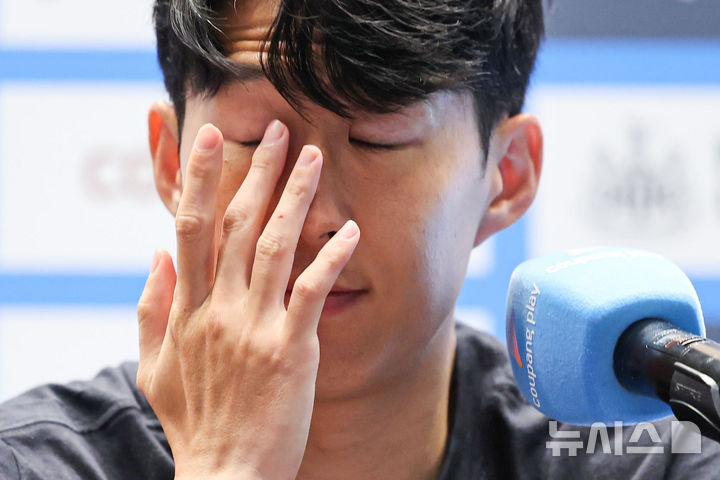 [서울=뉴시스] 권창회 기자 = 잉글랜드 프리미어리그 토트넘 홋스퍼 손흥민이 2일 오전 서울 여의도 IFC몰에서 열린 2025 쿠팡플레이 시리즈 토트넘 기자회견에서 생각에 잠겨 있다. 2025.08.02. [email protected]