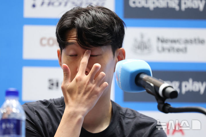[서울=뉴시스] 권창회 기자 = 잉글랜드 프리미어리그 토트넘 홋스퍼 손흥민이 2일 오전 서울 여의도 IFC몰에서 열린 2025 쿠팡플레이 시리즈 토트넘 기자회견에서 눈을 만지고 있다. 2025.08.02. [email protected]