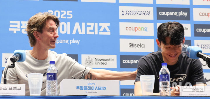 [서울=뉴시스] 권창회 기자 = 잉글랜드 프리미어리그 토트넘 홋스퍼 토마스 프랭크 감독이 2일 오전 서울 여의도 IFC몰에서 열린 2025 쿠팡플레이 시리즈 토트넘 기자회견에서 손흥민을 격려하고 있다. 2025.08.02. [email protected]