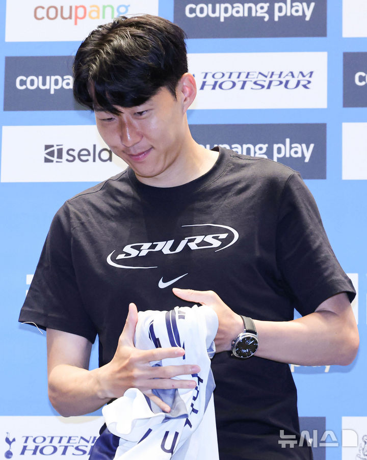 [서울=뉴시스] 권창회 기자 = 잉글랜드 프리미어리그 토트넘 홋스퍼 손흥민이 2일 오전 서울 여의도 IFC몰에서 열린 2025 쿠팡플레이 시리즈 토트넘 기자회견에서 기념촬영을 마치고 유니폼을 정리하고 있다. 2025.08.02. [email protected]