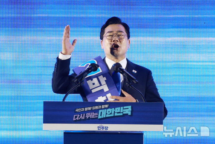 [고양=뉴시스] 고승민 기자 = 박찬대 더불어민주당 대표 후보가 2일 경기 고양 킨텍스에서 열린 더불어민주당 제2차 임시전국당원대회에서 정견발표를 하고 있다. 2025.08.02. [email protected]