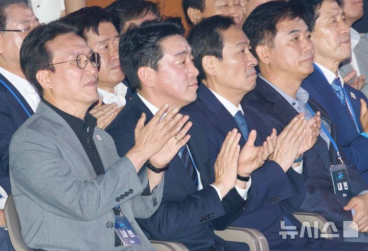 [고양=뉴시스] 고승민 기자 = 김민석 국무총리(왼쪽부터), 강훈식 비서실장, 우상호 정무수석, 김병욱 정무비서관이 2일 오후 경기 고양시 킨텍스에서 열린 제2차 임시전국당원대회에서 박수를 치고 있다. (공동취재) 2025.08.02. [email protected]
