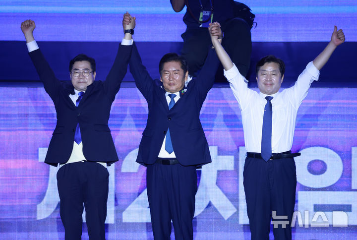 [고양=뉴시스] 고승민 기자 = 정청래 신임 더불어민주당 대표가 2일 경기 고양 킨텍스에서 열린 더불어민주당 제2차 임시전국당원대회에서 박찬대 후보, 황명선 신임 최고위원과 인사를 하고 있다. 2025.08.02. [email protected]