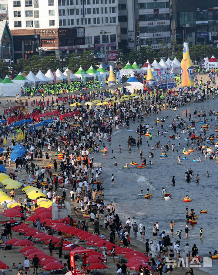 [부산=뉴시스] 하경민 기자 = 부산지역에 폭염경보가 발효 중인 2일 부산 수영구 광안리해수욕장에서 피서객들이 물놀이를 즐기고 있다. 2025.08.02. [email protected]