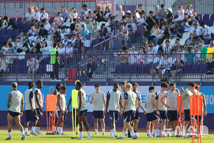 [안양=뉴시스] 권창회 기자 = 잉글랜드 프리미어리그 토트넘 홋스퍼 손흥민을 비롯한 선수들이 2일 경기 안양시 안양종합운동장에서 열린 2025 쿠팡플레이 시리즈 토트넘 오픈 트레이닝에서 훈련을 하고 있다. 2025.08.02. [email protected]