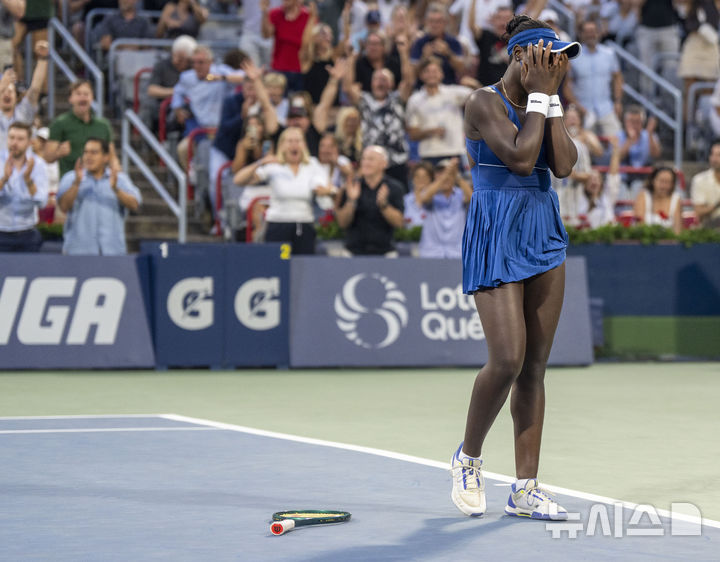 [몬트리올=AP/뉴시스] 빅토리아 음보코(85위·캐나다)가 2일(현지 시간) 캐나다 몬트리올에서 열린 여자프로테니스(WTA) 투어 옴니엄 뱅크 내셔널(WTA1000) 단식 16강전에서 코코 고프(2위·미국)를 꺾은 후 기뻐하고 있다. 올해 18세의 음보코가 프랑스오픈 우승자인 고프를 2-0(6-1 6-4)으로 완파하고 8강에 올랐다. 2025.08.03.