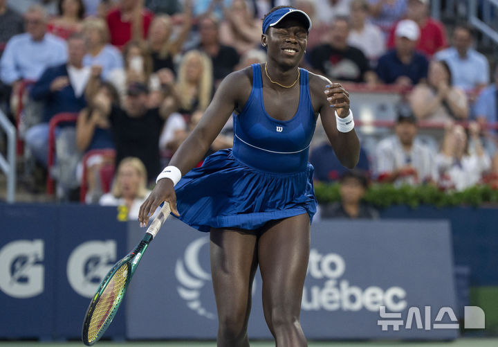 [몬트리올=AP/뉴시스] 빅토리아 음보코(85위·캐나다)가 2일(현지 시간) 캐나다 몬트리올에서 열린 여자프로테니스(WTA) 투어 옴니엄 뱅크 내셔널(WTA1000) 단식 16강전에서 코코 고프(2위·미국)를 꺾은 후 기뻐하고 있다. 올해 18세의 음보코가 프랑스오픈 우승자인 고프를 2-0(6-1 6-4)으로 완파하고 8강에 올랐다. 2025.08.03.