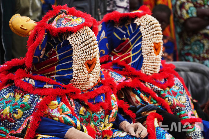 [포르토노보=AP/뉴시스] 2일(현지 시간) 베냉 수도 포르토노보에서 열린 제2회 가면 축제에서 다양한 가면과 의상의 참가자들이 축제를 즐기고 있다. 이 축제에서는 신성한 종교적 의미를 지닌 마스크부터 세속적 의미의 가면까지 다양한 마스크가 대열을 이루어 주요 거리를 누빈다. 2025.08.03.