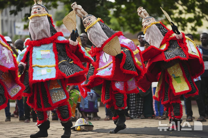 [포르토노보=AP/뉴시스] 2일(현지 시간) 베냉 수도 포르토노보에서 열린 제2회 가면 축제에서 가면과 의상을 착용한 남성이 춤추고 있다. 이 축제에서는 신성한 종교적 의미를 지닌 마스크부터 세속적 의미의 가면까지 다양한 마스크가 대열을 이루어 주요 거리를 누빈다. 2025.08.03.