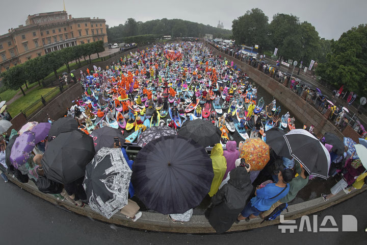 [상트페테르부르크=AP/뉴시스] 2일(현지 시간) 러시아 상트페테르부르크 모이카강에서 비가 내리는 가운데 열린 연례 ‘폰탄카’ 스탠드업 패들보드(SUP) 축제 참가자들이 패들보드를 젓고 있다. 이 축제에는 1만 명이 넘는 참가자가 함께했다. 2025.08.03.