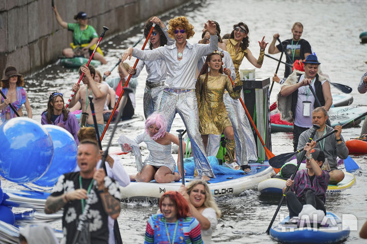 [상트페테르부르크=AP/뉴시스] 2일(현지 시간) 러시아 상트페테르부르크 모이카강에서 비가 내리는 가운데 열린 연례 ‘폰탄카’ 스탠드업 패들보드(SUP) 축제 참가자들이 패들보드를 젓고 있다. 이 축제에는 1만 명이 넘는 참가자가 함께했다. 2025.08.03.