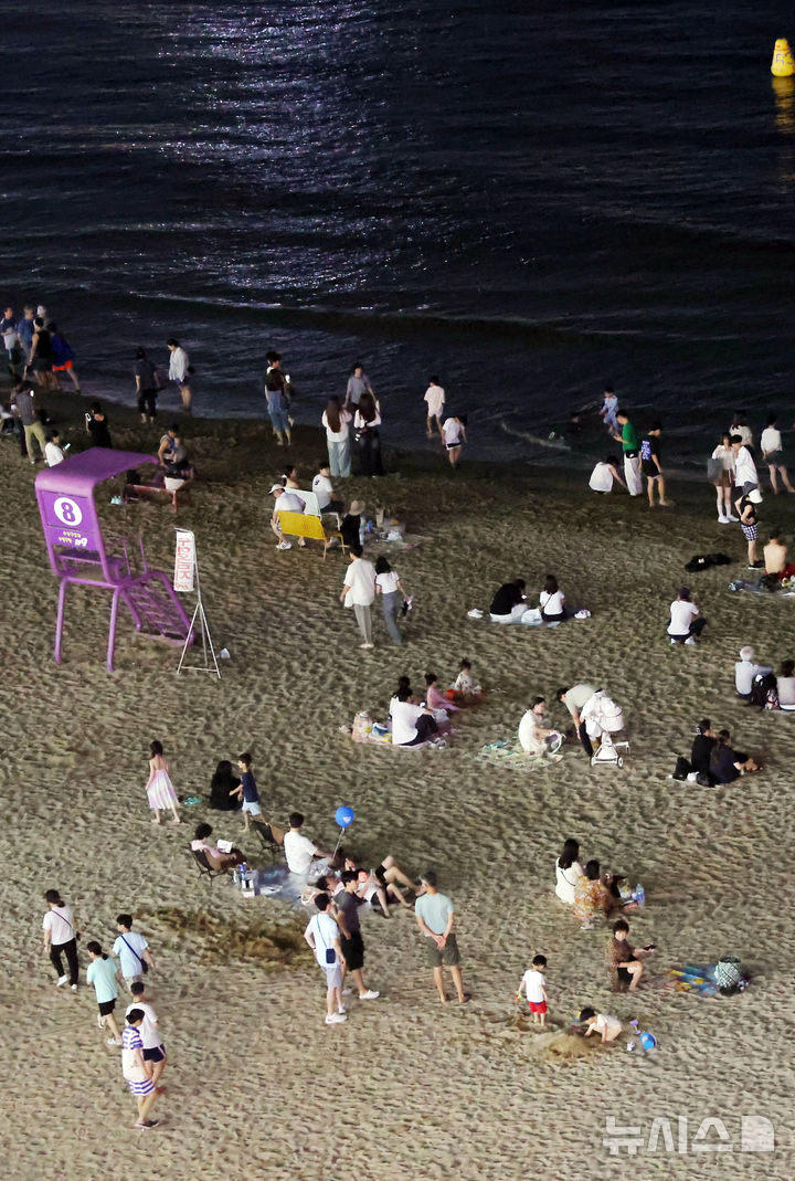 [부산=뉴시스] 하경민 기자 = 폭염특보와 열대야 현상으로 밤낮 가리지 않고 푹푹 찌는 더위가 이어진 2일 밤 부산 수영구 광안리해수욕장에서 시민과 관광객들이 더위를 식히고 있다. 2025.08.03. [email protected]