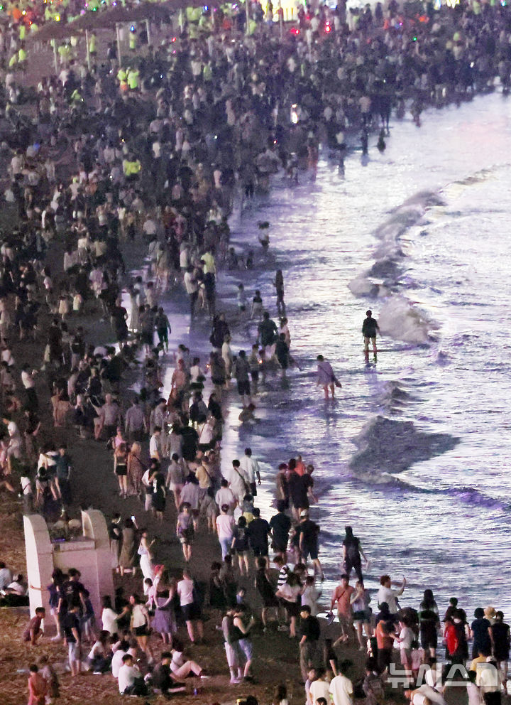 [부산=뉴시스] 하경민 기자 = 폭염특보와 열대야 현상으로 밤낮 가리지 않고 푹푹 찌는 더위가 이어진 2일 밤 부산 수영구 광안리해수욕장에서 시민과 관광객들이 더위를 식히고 있다. 2025.08.03. [email protected]
