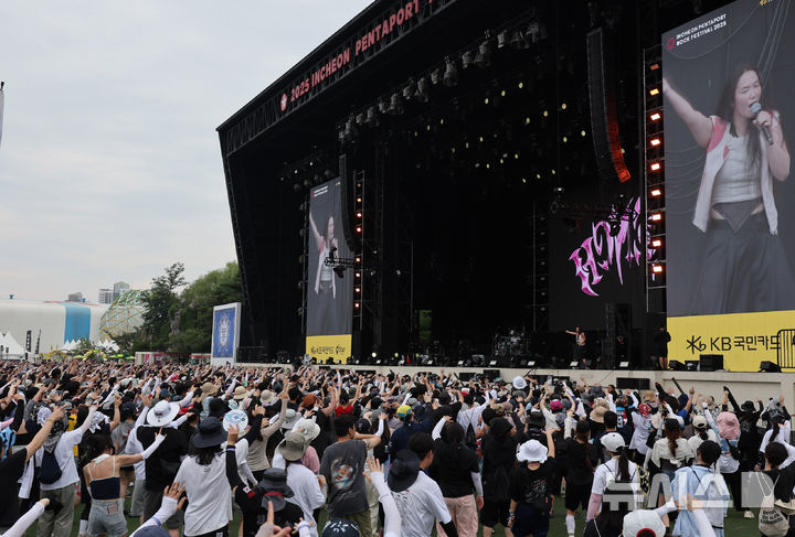 [인천=뉴시스] 전진환 기자 = 3일 오후 인천 연수구 송도달빛축제공원에서 열린 '2025 인천펜타포트 락 페스티벌'에서 관람객들이 오드리 누나(AUDREY NUNA)의 공연을 관람하고 있다. 2025.08.03. [email protected]